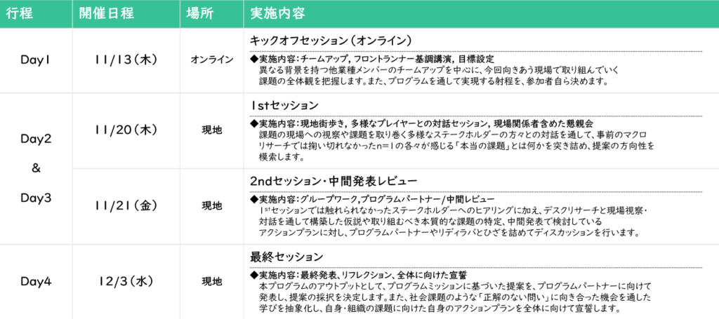 4日間・延べ3週間のプログラムで、課題の実情を体感し、様々なステークホルダーと対話しながら本質的な課題とアクションを見極め、トップランナーへの提言を行いますまた、最終日にはリフレクションを行い、未知の課題に向き合う中での個々人の学び・気づき・変化を総括します。