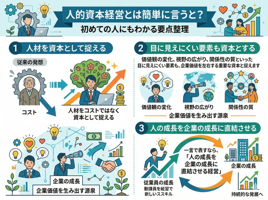 人的資本経営とは簡単に言えば、「人にかけるお金や時間は、利益や価値を生み出す投資である」と考える経営です。