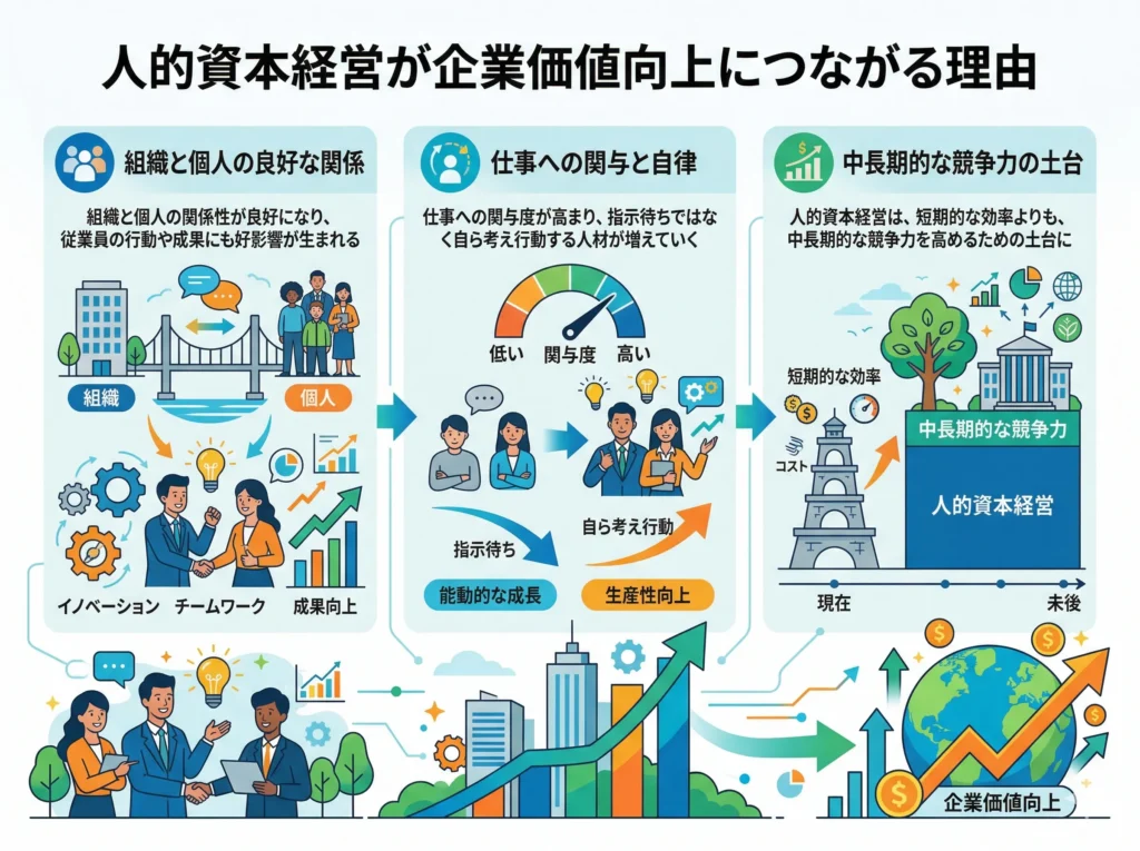 単に人を配置し、評価し、管理するのではなく、「人がどのように成長し、どのような行動をとることで企業の価値創造につながるのか」を経営の中心テーマとして据える点に特徴があります。