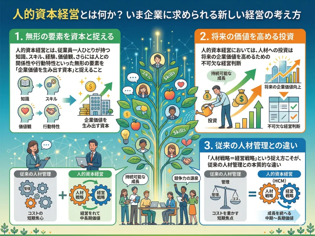人的資本経営とは、従業員一人ひとりが持つ知識、スキル、経験、価値観、さらには人との関係性や行動特性といった無形の要素を「企業価値を生み出す資本」と捉え、その価値を最大化するために中長期視点で投資・活用していく経営の考え方です。