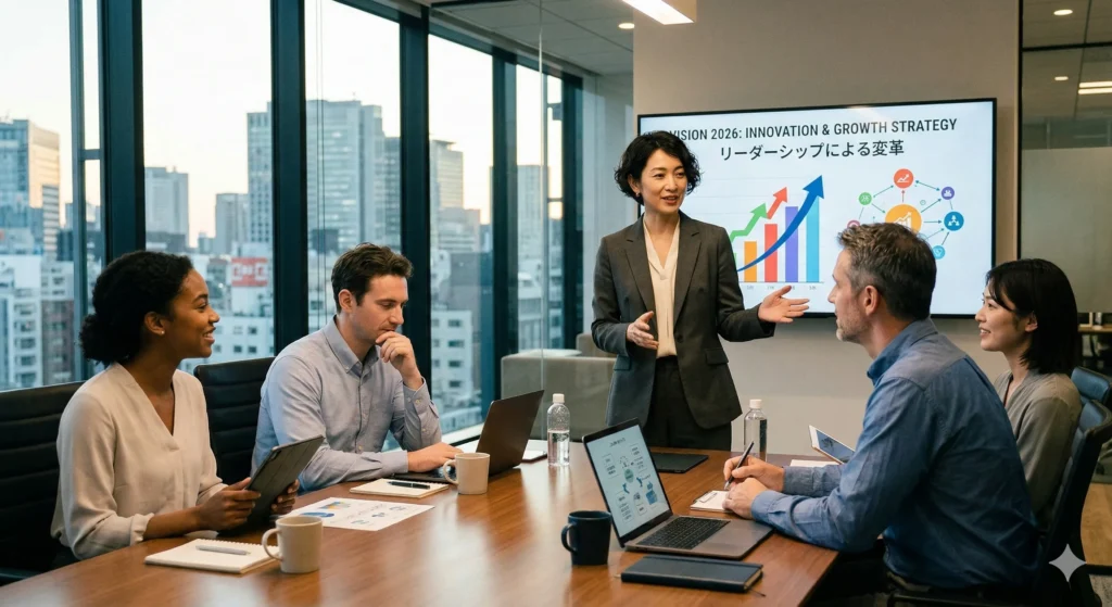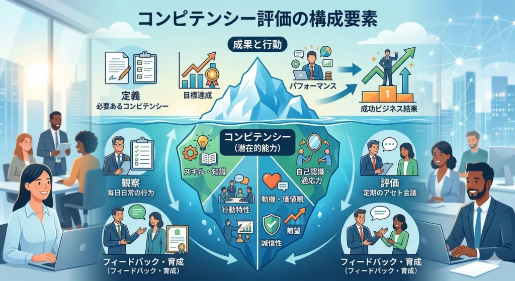 コンピテンシーは「成果につながる行動特性」です。ビジョン提示、関係構築、分析・構造化、実行・検証などの指標を定義し、360度評価や行動事実の記録で定点観測します。