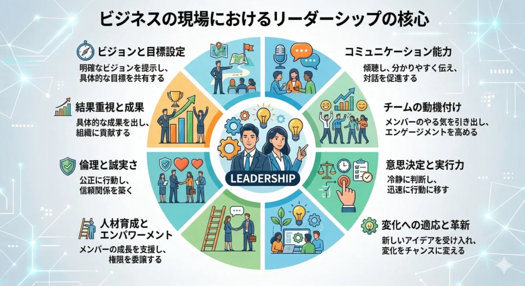 単なるカリスマ性やスピーチ力ではなく、目標を言語化し、合意を形成し、必要な資源と関係性を編成し、実行と学習のサイクルを回す一連の働きかけを指します。