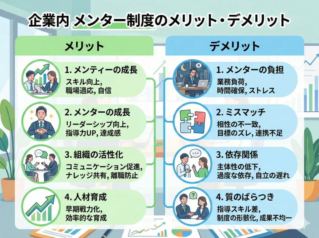 一方で、よく指摘されるデメリットは、メンター側の負担増です。本来の業務に加えてメンター業務を担うため、時間的・精神的な余裕がないと形骸化しやすくなります。