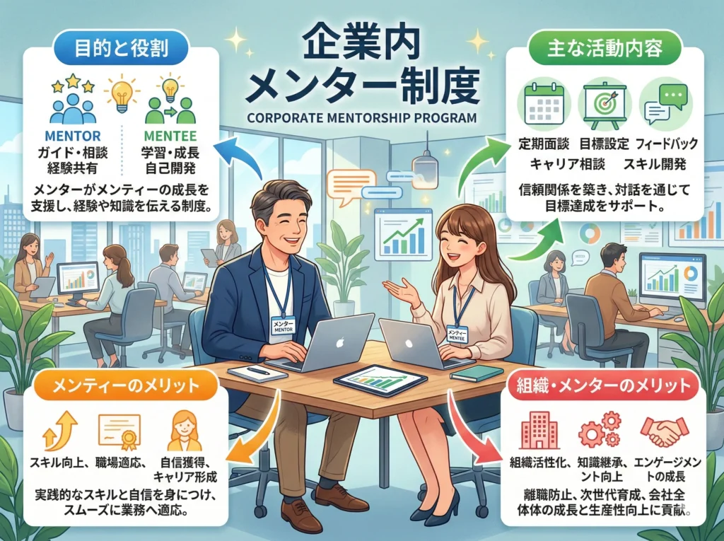 メンター制度とは、企業内において一定の経験を持つ社員(メンター)が、若手社員や新入社員(メンティー)に対して、業務だけでなく心理的・キャリア的な側面も含めた支援を行う制度です。